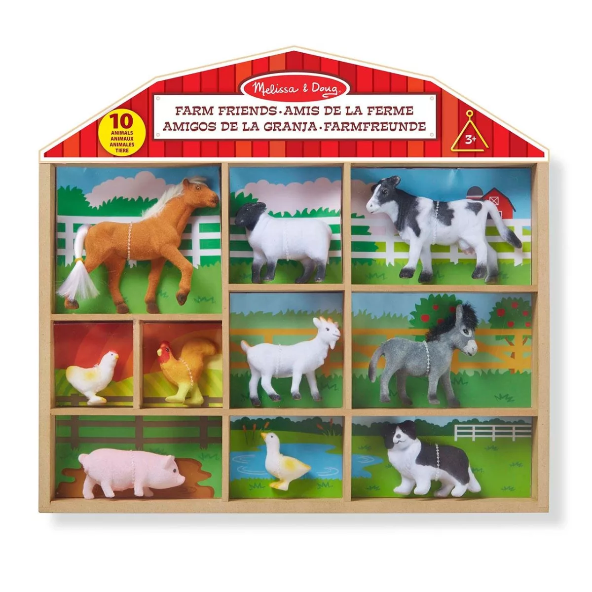 10db válogatott miniatűr háziállat figura gyűjteménye körülbelül 2,5 – 10 cm magasságig. Az állatok között megtalálható a ló, csirke, disznó, kacsa, tehén, szamár, kecske, kakas, juh és a border collie kutyus. Szórakoztató tényeket tartalmaz minden állatról. A tömör kis figurák önállóan megállnak saját lábaikon, és tartós fából készült, rekeszes tárolóban tarthatók.