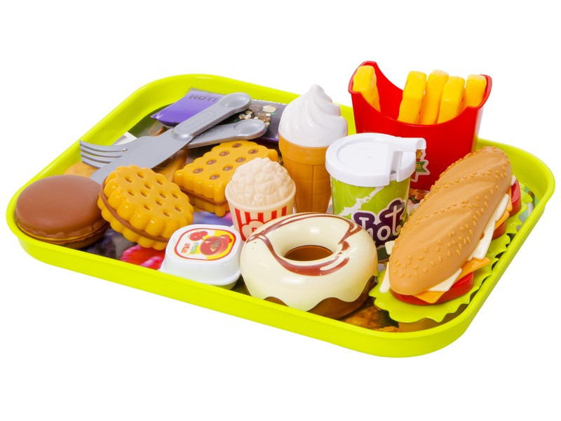 A készlet tartalmaz 15 db különböző ételt és nyalánkságot, valamint egy neonzöld tálcát.