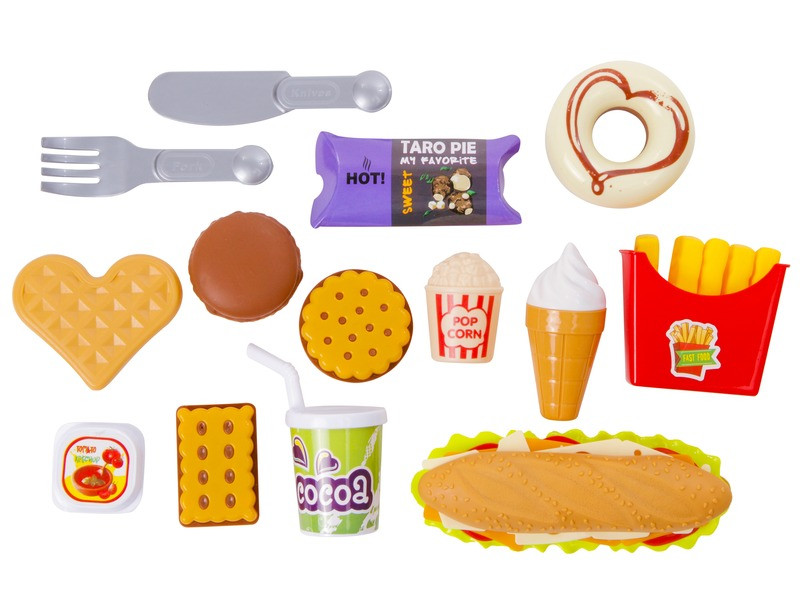 Foglalj helyet és fogyassz kedvedre kedvenc ételeidből! A Ételszett 15 db-os játékkészlettel most belevetheted magad a gasztronómia izgalmaiba. Ismerd meg az ételeket játékos módon! A készletben megtalálod a gyorséttermek híres eledelét a sült krumplit és a hamburgert. Ha végeztél ezzel a színpompás menüvel, leöblítheted egy szívószálas kakaóval és desszertként elfogyaszthatod a játékban található édességek egyikét. A nyalánkságok között találsz fagyit, gofrit, fánkot, kekszet és még egy különleges taro pitét is. Készítsd el a rendeléseket saját éttermedben, vagy légy Te a vevő. A játék kimenetelét csak a Te fantáziád határozza meg. Főzz, süss és étkezz akár barátaid társaságában is.