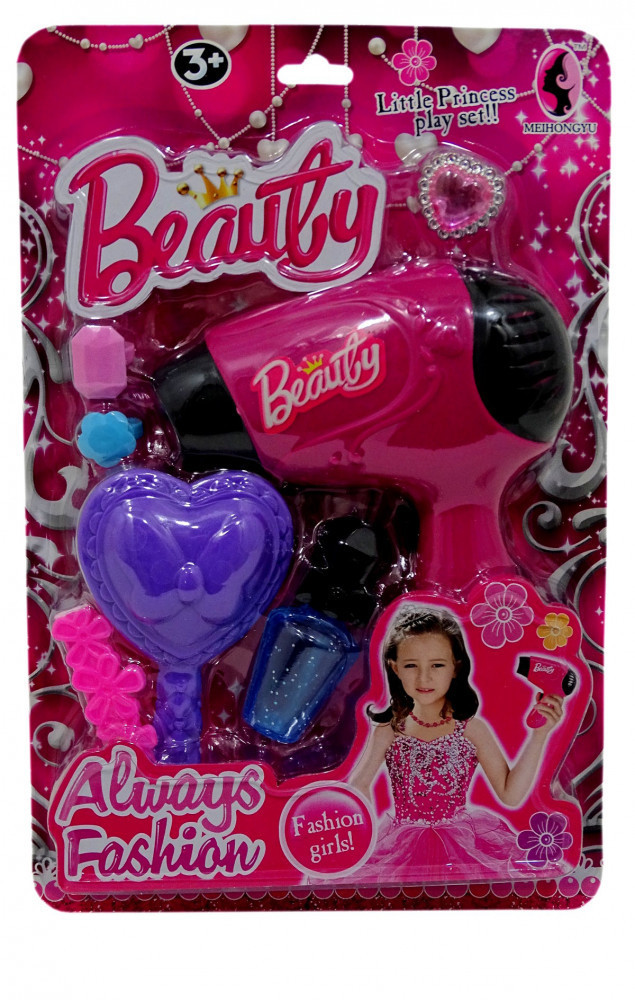 A hajszárítón kívül még a lányos otthoni szerepjátéknak elengedhetetlen kellékeit is tartalmazza ez a szett.
