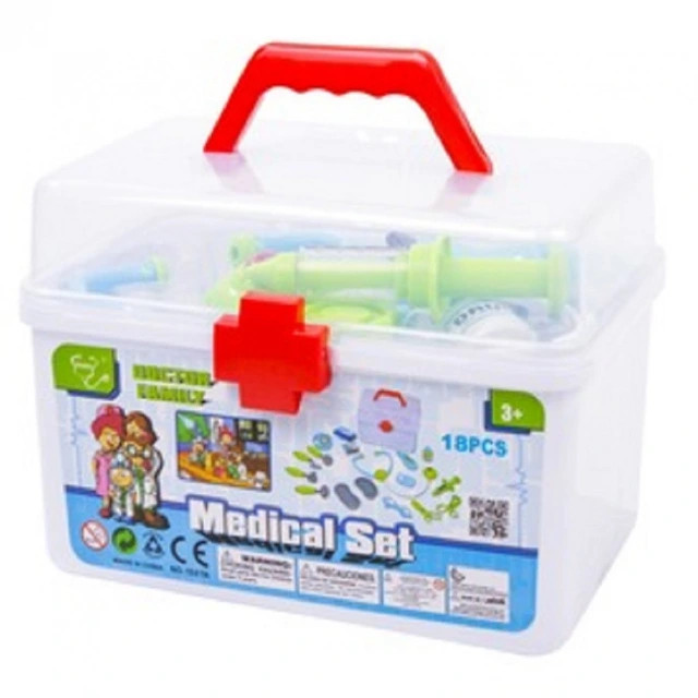 Vizsgáld és gyógyítsd meg a betegeket! Az Orvosi doboz 18 darabos készlet egy műanyag vöröskeresztes láda, rengeteg orvosi eszközzel. A sztetoszkóppal meg tudod hallgatni a páciens szívét, vizsgáld meg a szemeit, a fülét és az orrát, és ha kiderült, hogy mi a baj, kezeld megfelelő gyógyszerrel. Az Orvosi doboz 18 darabos készlet segít megbarátkozni az orvossal, egy fehér köpennyel szerepjátékot is játszhatsz vele! A doboz méretei: 27 x 19 x 20 cm.
