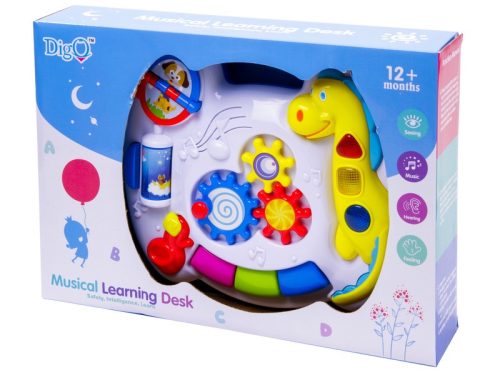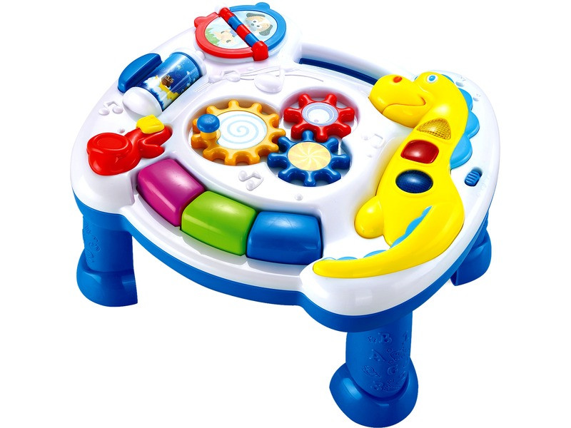 Rengeteg meglepetés és felfedezni való vár a készségfejlesztő asztalon! A Dínós bébi készségfejlesztő asztal vidám dallamokkal, változatos színekkel kelti fel a gyerek érdeklődését. Az asztal játékait, gombjait nyomogatva mindenhol színes fények gyulladnak ki, és különböző zenék szólnak, amik segítenek a pici megfigyelő képességének a fejlődésében. A lapozós játék az állatokat mutatja be, míg a hengert gombnyomással lehet forgatni, hogy más képet láthasson a pici. A középen található tekerős játék pedig mókás kattogó hangot ad ki magából. A Dínós bébi készségfejlesztő asztal fejleszti a gyerek kézügyességét, segít a mozgáskoordinációban is. A játékot a kiságyra is fel lehet fogatni, de a lábakat felszerelve ülve is lehet vele játszani.