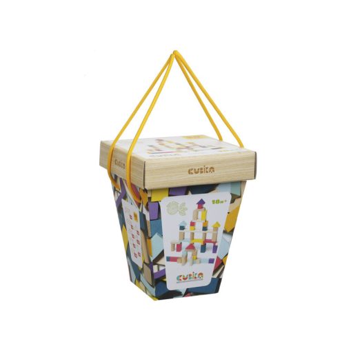 Egy igazán hasznos és szórakoztató alap építőjáték szett 100 darab, különböző formájú és színű fa építőkockával, praktikus csomagolásban. A doboz zárható fedéllel rendelkezik és zsinór füleinek köszönhetően könnyedén vihetjük magunkkal bárhová. Az építőkockák formáinak köszönhetően sokféle módon variálhatók, szinte bármilyen formát és építményt kirakhatnak belőle a gyerekek. A kockák egy része vidám színekben pompázik, így a variációk száma tovább fokozható.