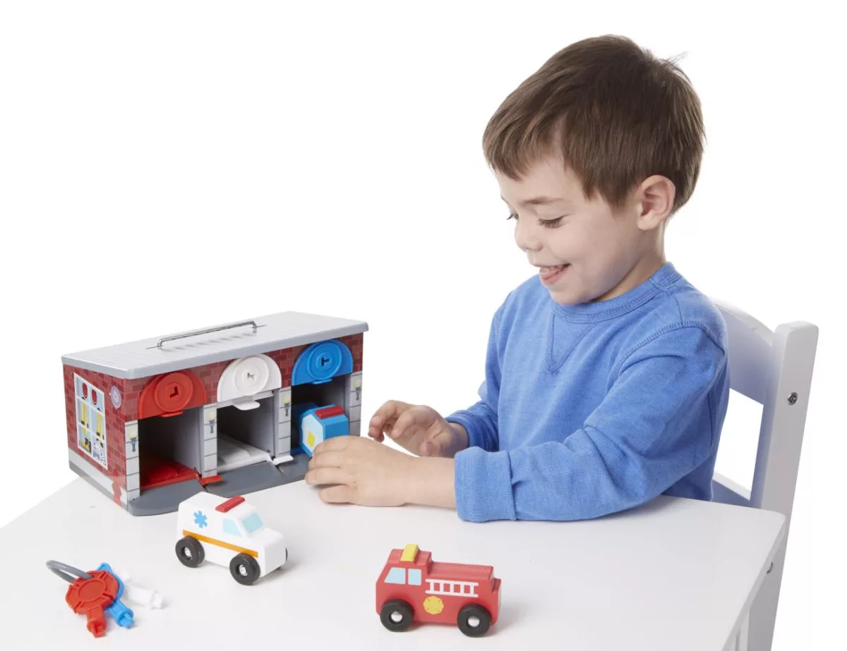 Melissa & Doug Fa készségfejlesztő játék, Garázs kulcsokkal és készenléti járművekkel