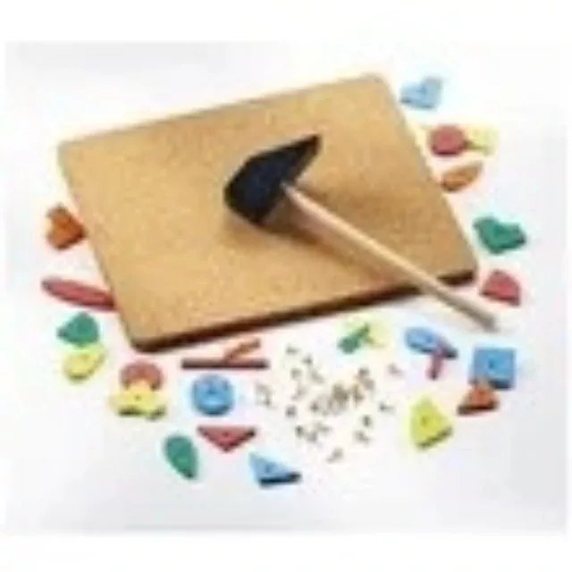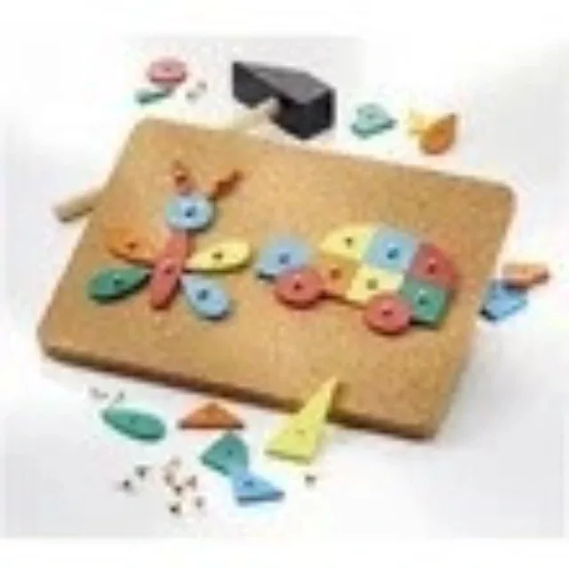 A készlet tartalmazza a parafatáblát, a színes formákat, miltonkapocs csomagot és a fakalapácsot.