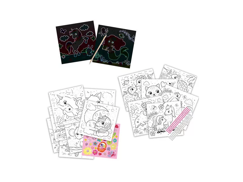 Tartalma: 7 x oldal csillogó matrica és színező, 6 x oldal gyöngy mozaik és színező, 2 x oldal csillogó karc, 1 x lap rózsaszín és fehér gyöngy, 1 x lapos csillogó matrica, 1 x karcoló toll.