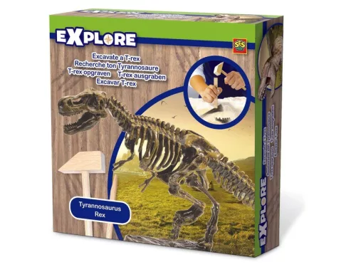Szabadítsd ki a gipszből a Tyrannosaurus Rex csontvázát! A SES T-Rex dinoszaurusz bányász készletben lévő nagy gipsztömbből különböző csontdarabokat tudsz előbányászni, amikből a legfélelmetesebb dínó, a Tyrannosaurus Rex csontvázát lehet összerakni. A gipszet egy fa vésővel és kalapáccsal tudod megbontani, és apróra törni, ha fogsz egy ecsetet, akkor az utolsó szem gipszet is le tudod pucolni a csontokról. Rakd össze a csontvázat és tanulmányozd, hogyan is nézett ki a legnagyobb dinoszaurusz!