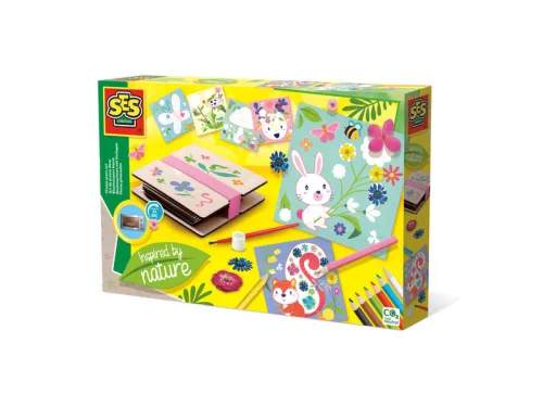A virágnyomó mellett a készlet 6 db színezőkártyát, ceruzát, ragasztót és egy ecsetet tartalmaz a szárított virágok műalkotásokká alakításához.