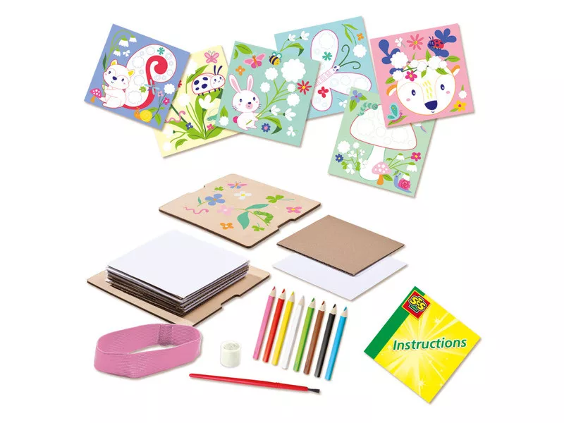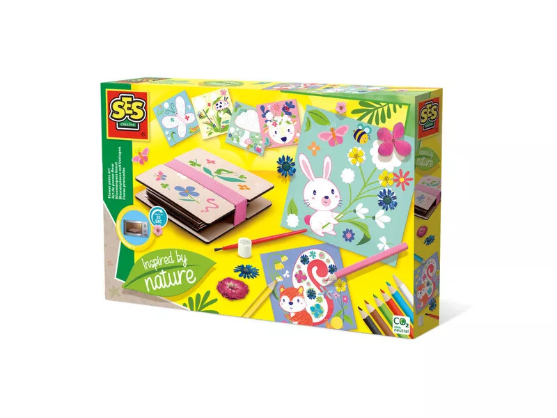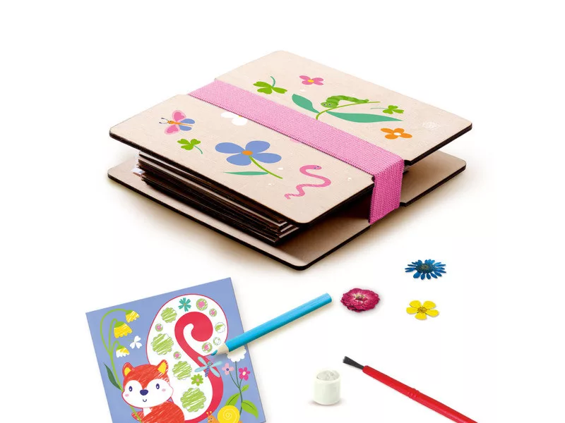 Tartalma: fából készült virágprés gumiszalaggal, 6 x színezőkártya, 8 x színes ceruza, ragasztó, ecset, használati utasítá