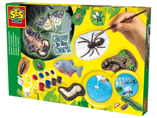 Rakj a szobádba ijesztő csúszómászókat! A SES Foszforeszkáló állatok gipszkiöntő készlettel bogarakat, skorpiót, pókot, legyet és egyéb riasztó rovarokat tudsz elkészíteni, öntőforma és festékek segítségével. Keverd vízzel tejföl sűrűségűre a modellgipszet, öntsd a formába, és ha megszáradt, akkor fesd ki a színes festékekkel. A készlet egy tégely fluoreszkáló festéket is tartalmaz, ami nappal feltöltődik fénnyel, és a sötétben hosszú ideig világít.