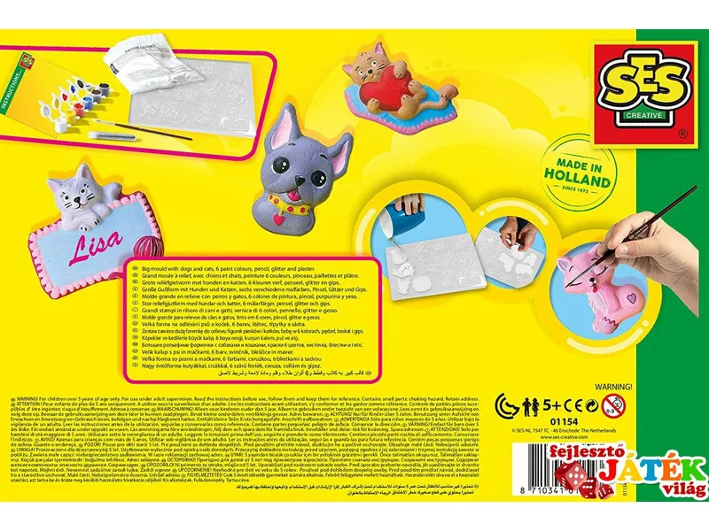Formázz gipszből cicás vagy kutyás szobrokat, ajándéktárgyakat! A SES Kutyák és cicák 3D gipszkiöntő készlet különböző öntőformákat, festéket, csillámot és gipszet rejt magában, amikkel különféle apró gipsztárgyakat tudsz kiönteni. A formákból összesen 12 figurát tudsz elkészíteni, köztük táskás kutyát, vagy nyújtózó cicát is. Keverd el a port kevés vízzel, majd öntsd a formába, simítsd el az alját! Ezután hagynod kell száradni a gipszet, és ha végül kiborítod az öntőformából, egy élethű kutya vagy cica marad a végeredmény! A Kutyák és cicák 3D gipszkiöntő készletben lévő festékekkel többféle színben is ki tudod festeni az elkészült állatokat. A Kutyák és cicák 3D gipszkiöntő készlet tartalma: 1 zacskó gipsz, 1 db öntőforma, 6 tégely festék, 1 tubus csillám, 1 db ecset. Csomagolás méretei: 30 x 3 x 20 cm.