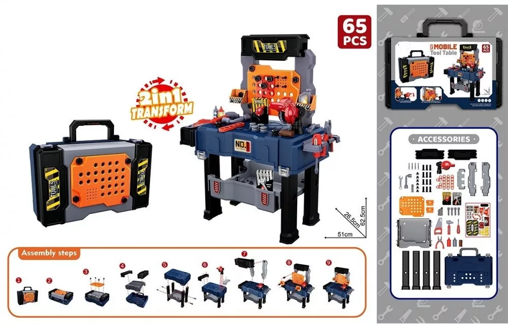 A szettel a szerszámok egy strapabíró, könnyen hordozható bőröndben érkeznek a kicsikhez. A bőrönd megkönnyíti a sok különböző szerszám elrendezését, tárolását és a szerszámok hordozását is. Ha pedig készek vagyunk a játékra akkor a 2 az 1-ben átalakulós bőröndünket egy méretés barkácsasztalként is használhatjuk.