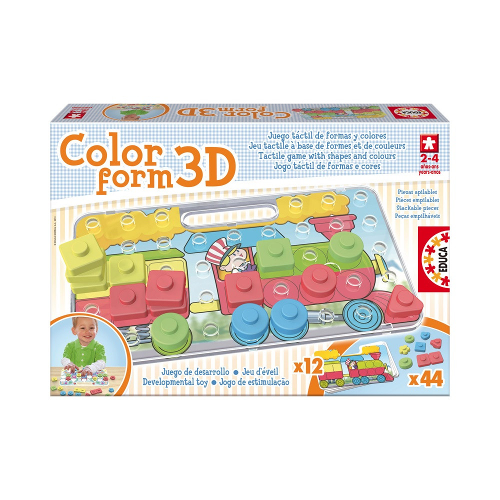 Az Educa szín és formarakó puzzle játékban a kisgyerekeknek a megfelelő formájú és színű darabokat, a megfelelő helyre kell illeszteniük. Az alapkép egy kis vonatot ábrázol. Kiválóan fejleszti a formák és színek felismerését. 2 éves kortól ajánljuk.