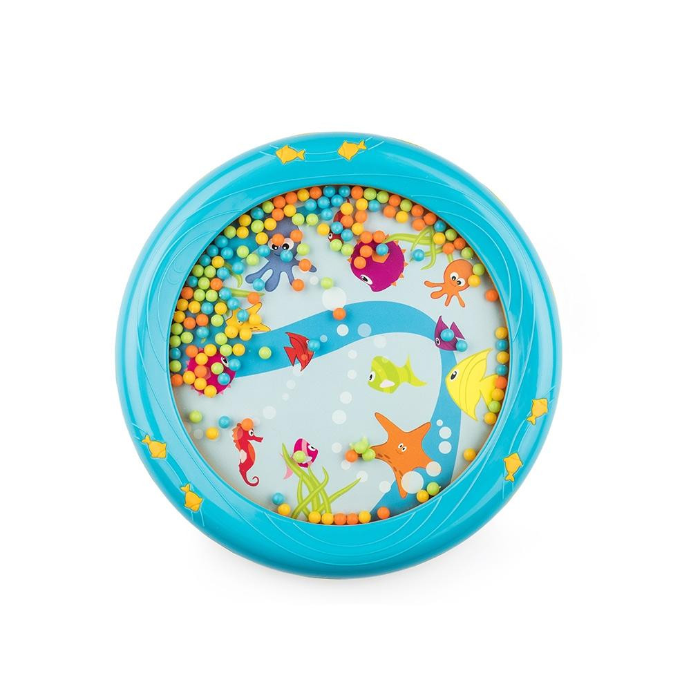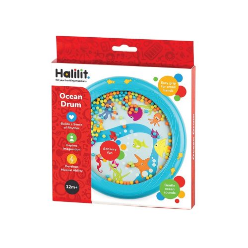A Halilit Bébi óceán dob élénk kék és sárga alapszínével, az aranyos kis tengeri állatkás mintával magára vonja az apróságok figyelmét. Nem csak a halacskákat, tengeri csillagokat és vízi csikókat  fedezhetik fel a mintázaton, de amint kis kezeikbe veszik a játékot, apró golyók zöme kezd csörögni, akár az óceán morajlása.